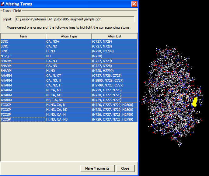 A key issue about the extensibility is to identify parameterization molecules. The following screenshot shows missing terms and corresponding fragment (highlighted) in the model: