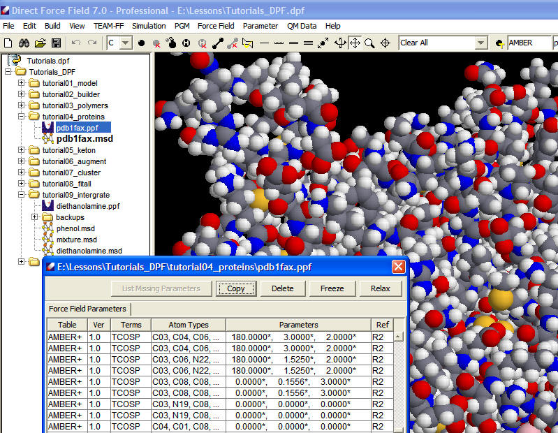 The following screenshot shows a protein with ligands and assigned force field parameters in DFF interface.