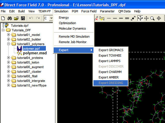 2) Export structure and parameter files for AMBER, CHARMM, CFF file formats so that many simulation engines can be used. The following screenshot shows the interface of export functionality.